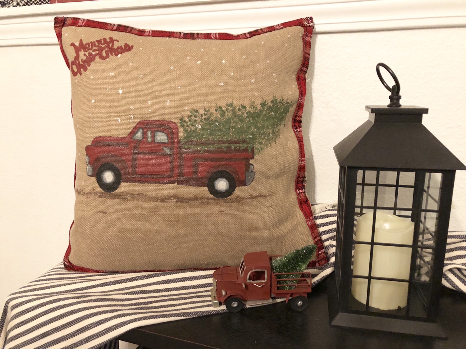 Pillows on my kitchen bench adds a little festive flair. 🙂 I found this pillow cover at Hobby Lobby and painted the truck onto it. It was a little tricky with the burlap texture but I’m happy with the end result.