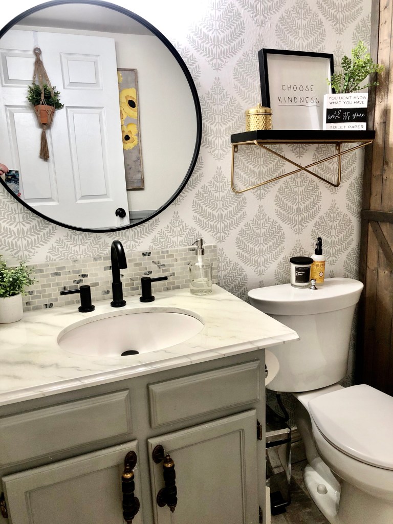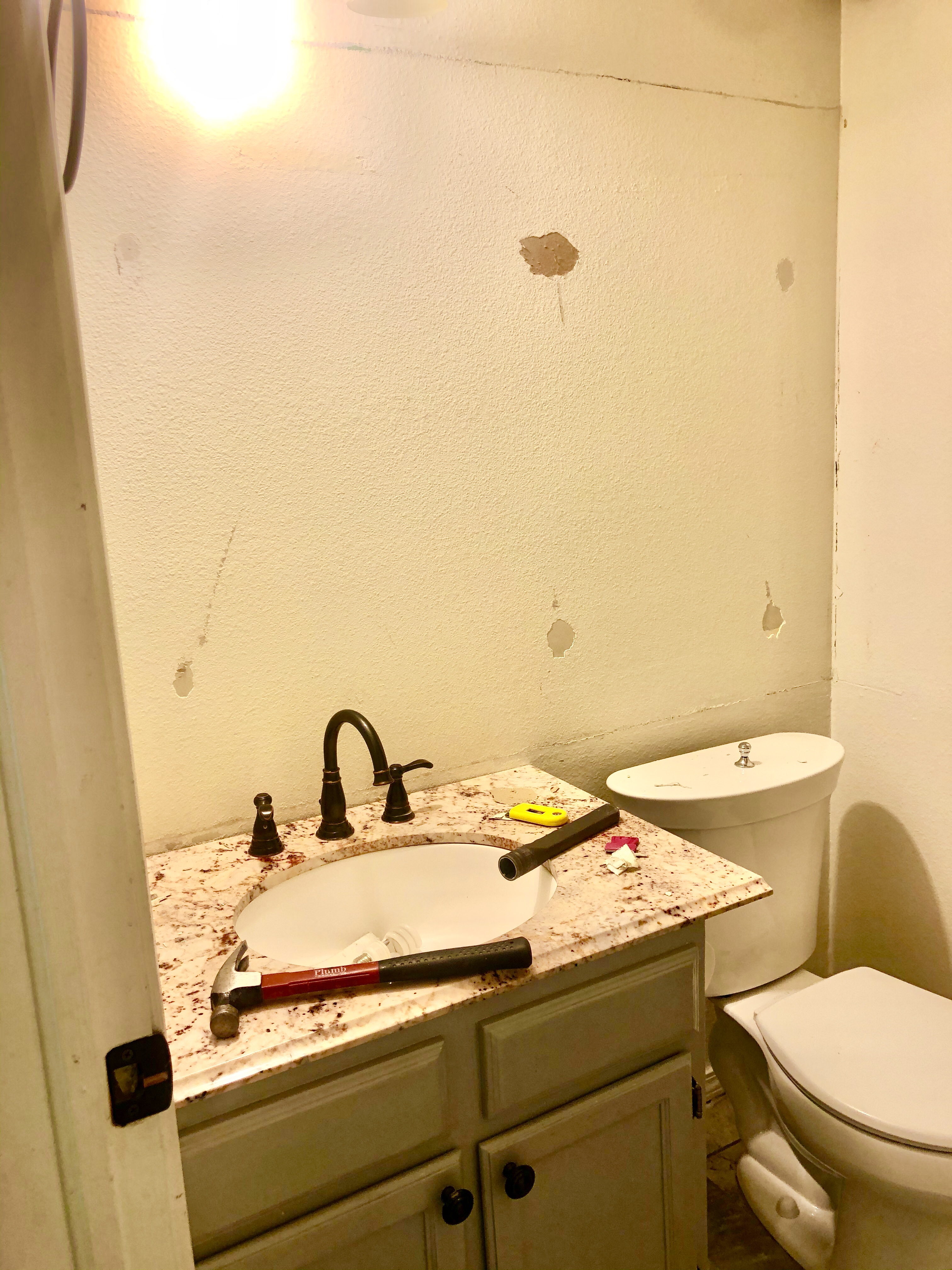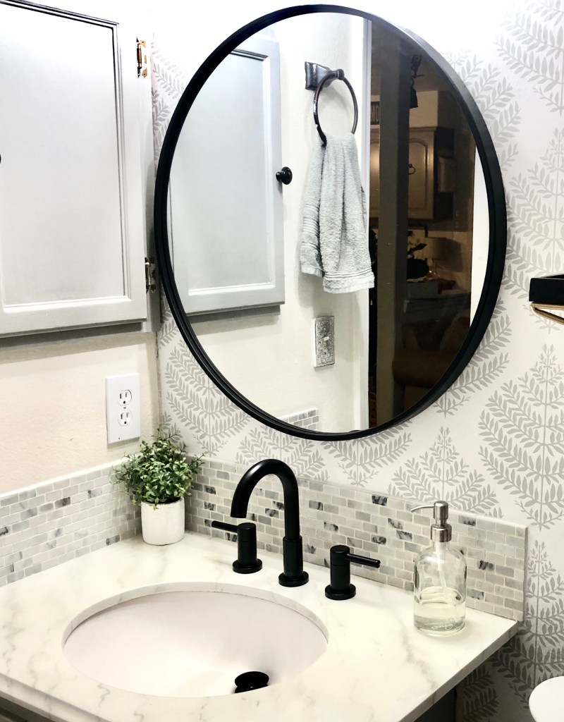 I really, really love Carrara marble. I don’t love the price tag, but who does? I decided to try painting my existing countertop and using an Epoxy coating. I had a 90’s guest bathroom that I’ve hated since we moved into our house. I decided to take down the ginormous 90’s mirror, change the lighting and faucet and update the countertop. I’m not quite through with this mini renovation but it’s coming along nicely.