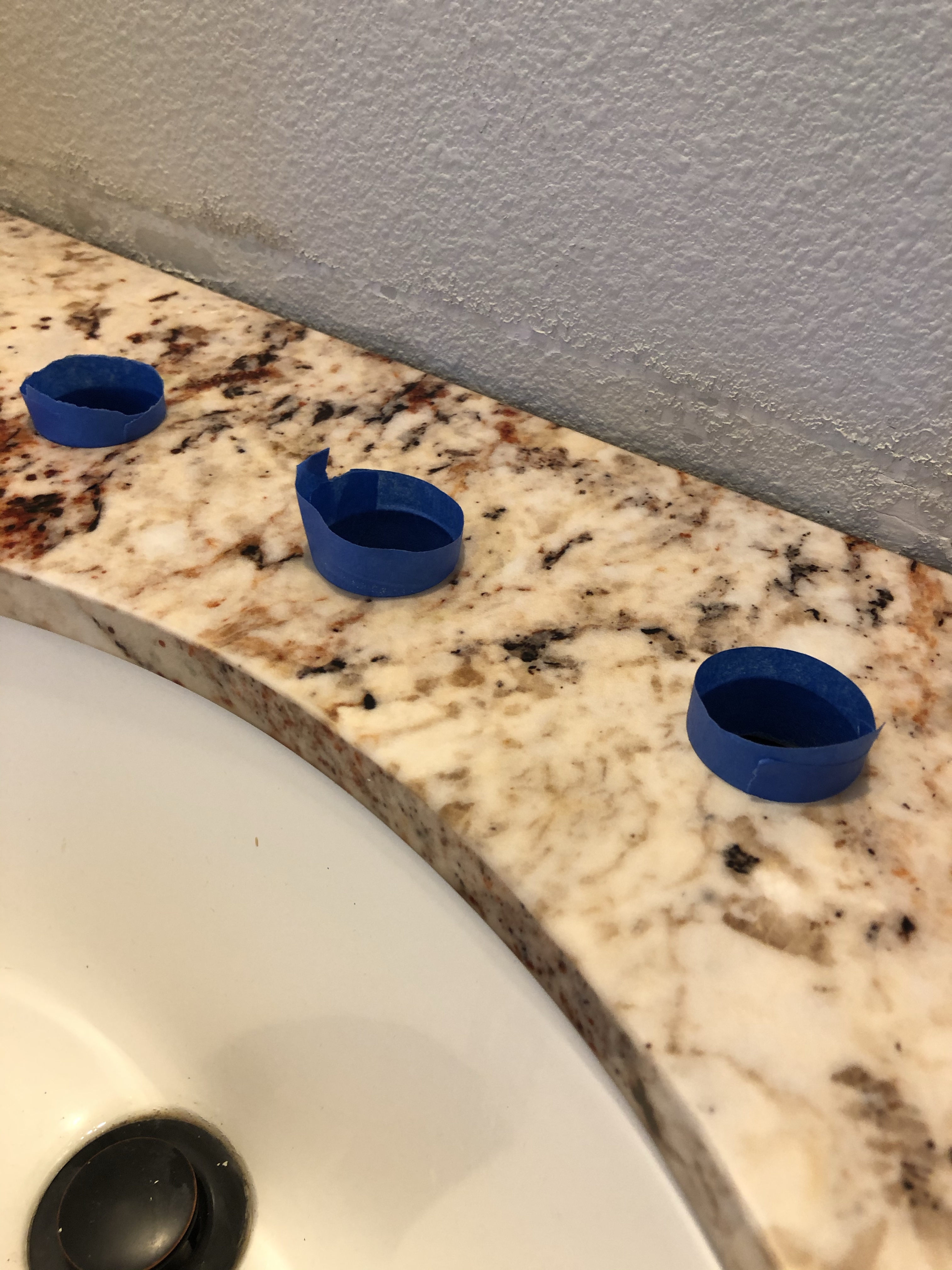 I used little silicone salad dressing cups that I wasn’t using. I taped them underneath the basin where the holes for the faucet are. -