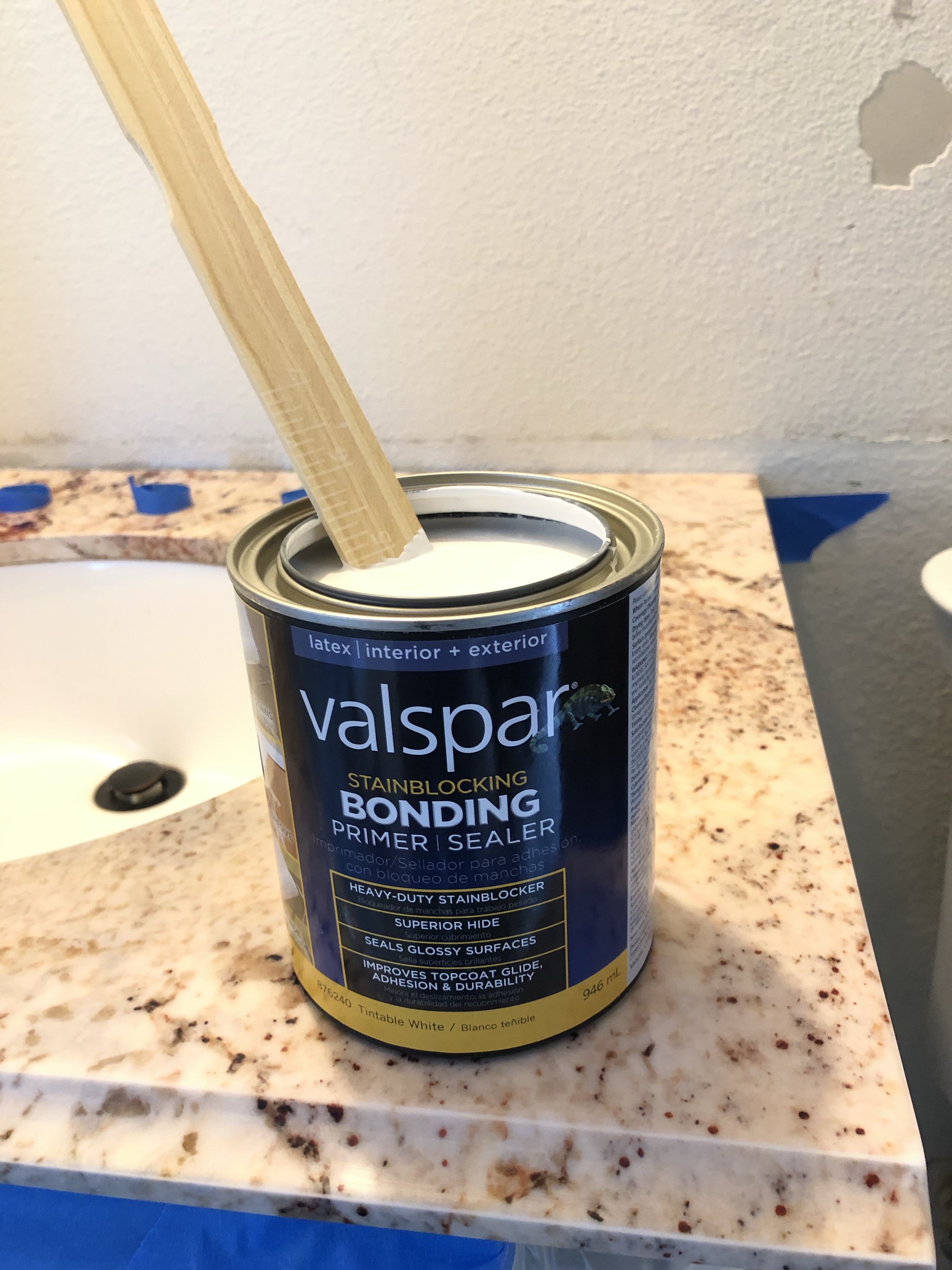 Prepping the counter to paint and refinish. I sanded it beforehand. I used painter’s tape in the holes for the faucet. -