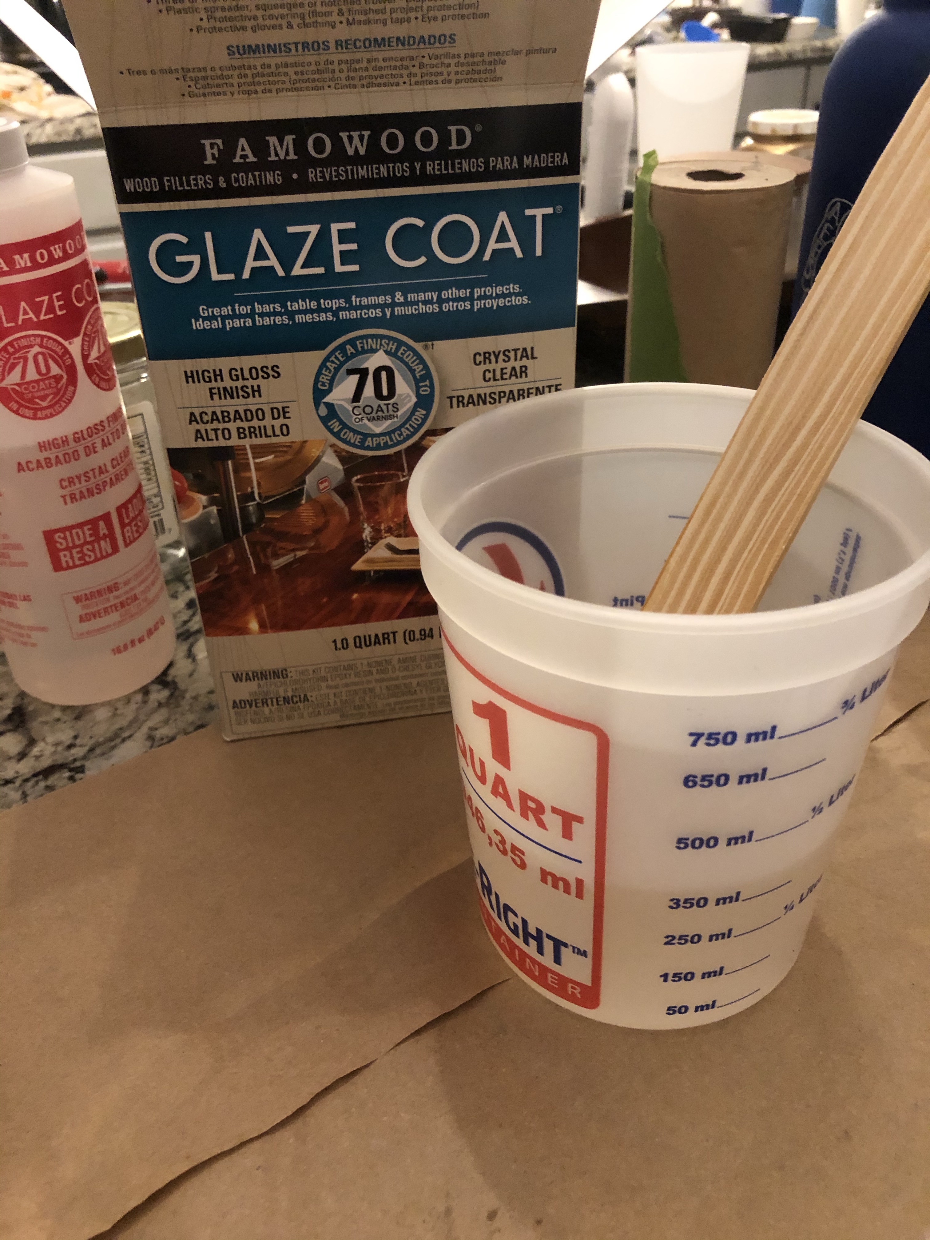 This is the Glaze Coat kit I purchased at Lowe’s. It’s an epoxy used for bar tops. -