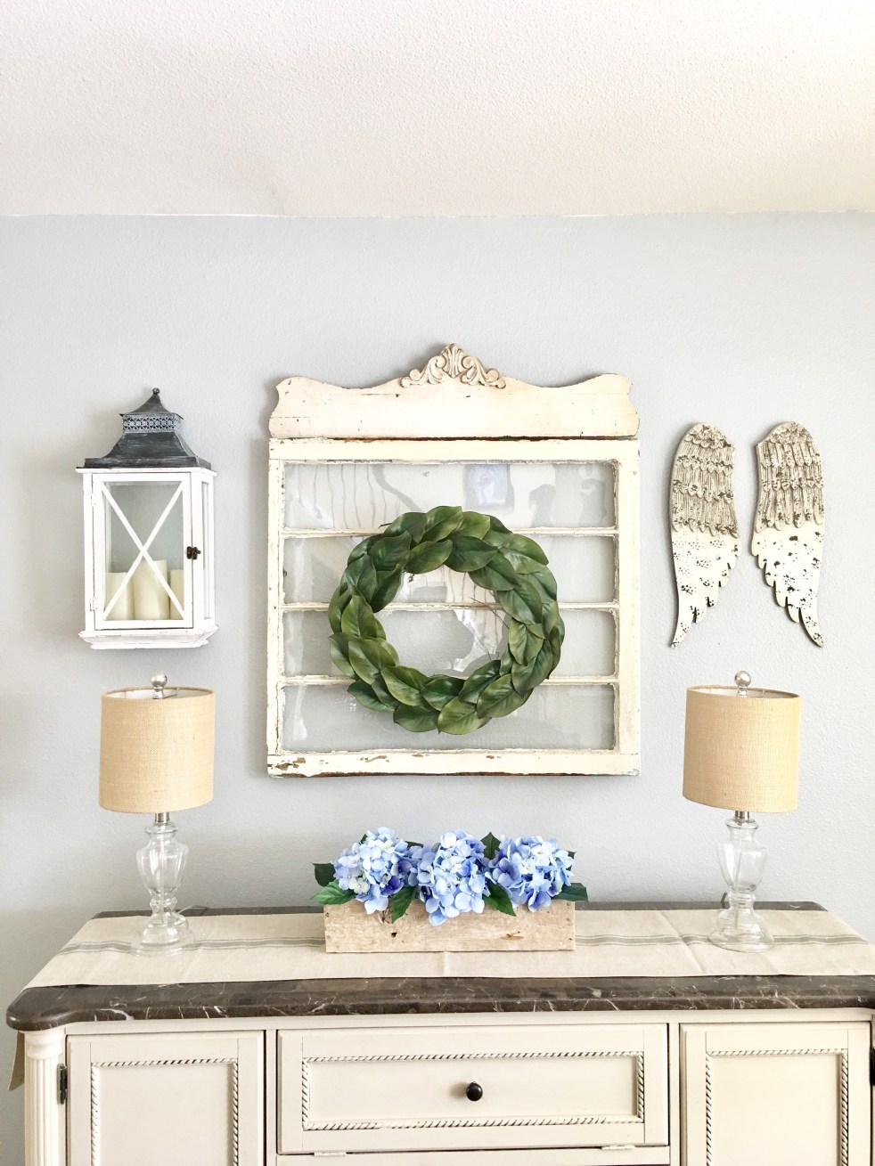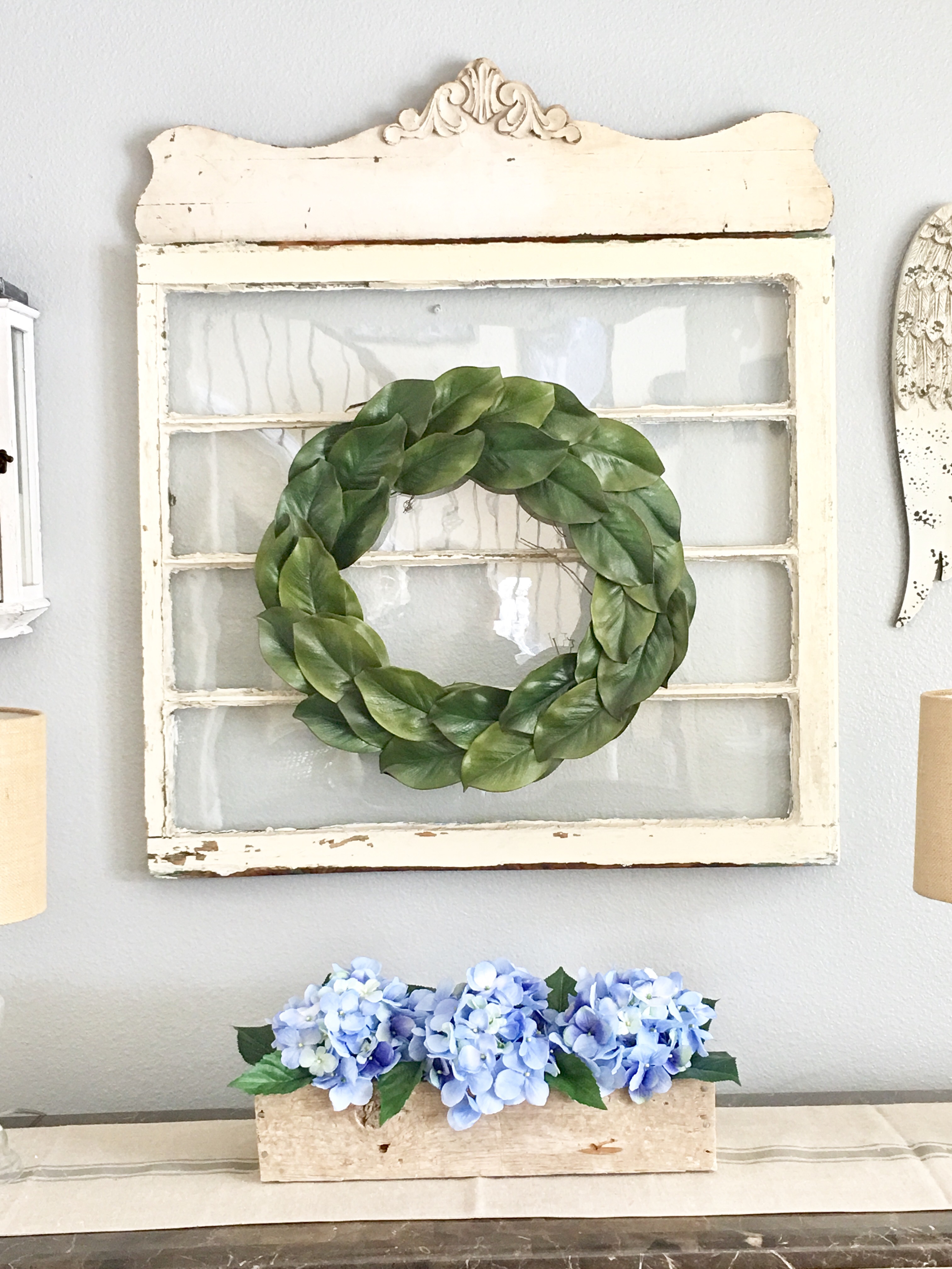 Spring = Hydrangeas!! The “periwinkle” blue shade is my favorite! I used pallet boards to make the rustic box I used in this photo. #carriagehousestaginganddesign #floraldesign #palletprojects