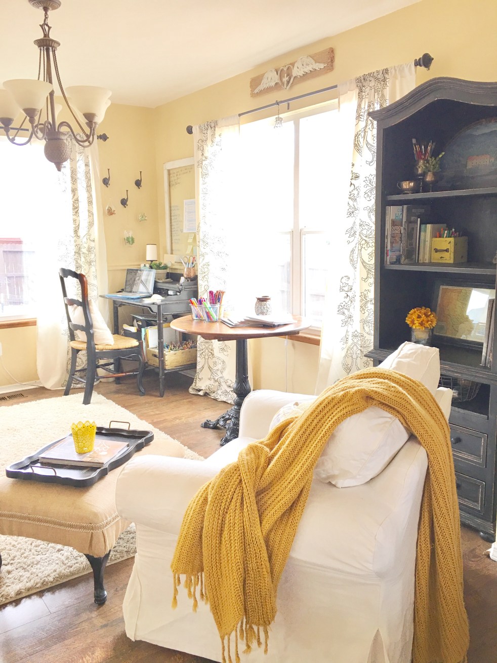 In inside view of my work area. I love the pop of yellow and the mellow feel of my office. It’s a comfortable place I like to spend time in.