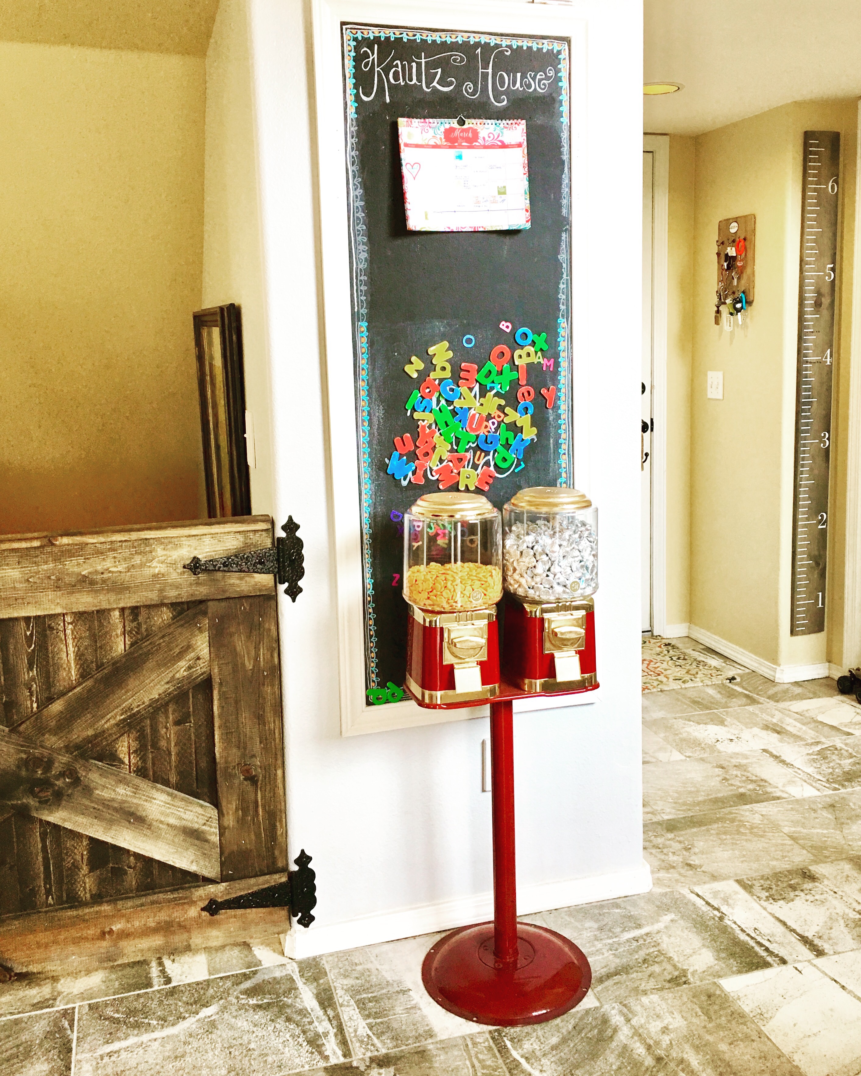 Grand Central Station at our house! We made this by using a plywood board, that we screwed onto the wall and painted it with magnetic chalkboard paint. Then we framed it with some decorative trim. Our kids love using the chalkboard and their magnetic letters. I added our family calendar to the top. 🙂 #carriagehousestaginganddesign