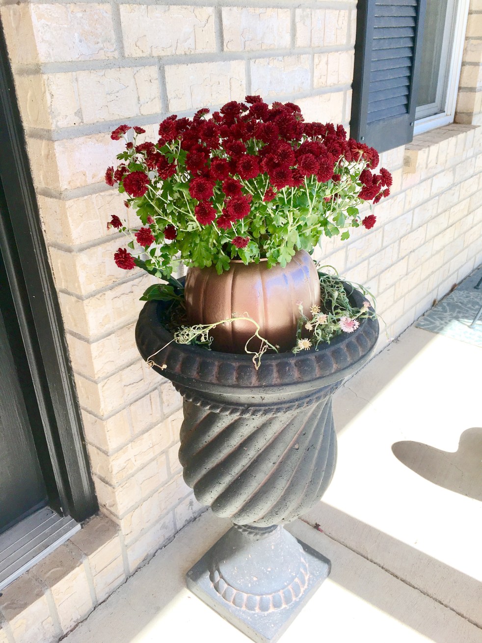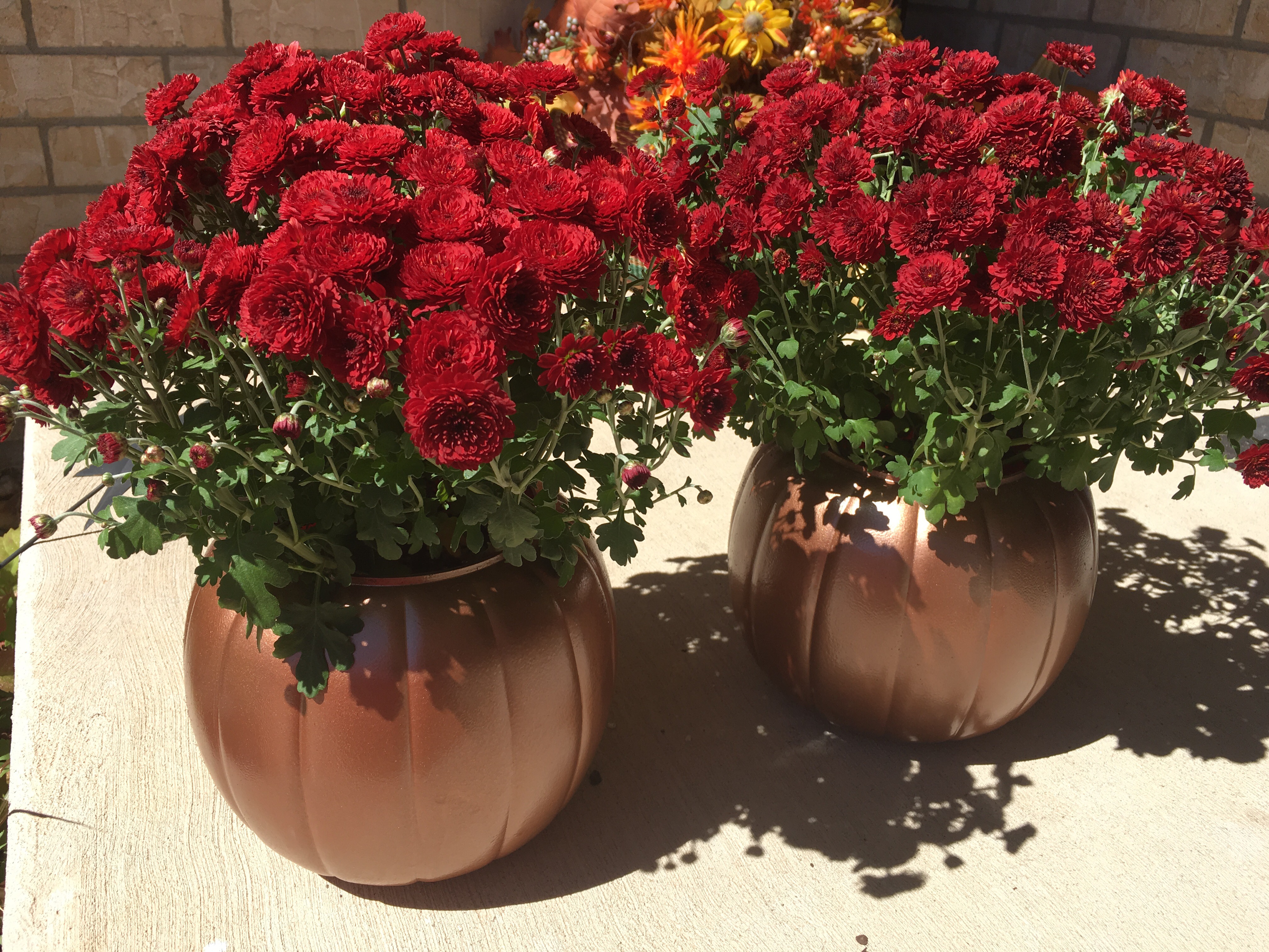 I have two large planters on either side of my front door and chose to set the mums on top of them. But, you could use them anywhere. You could also choose different sizes and group them together. I think these would make great gifts too!